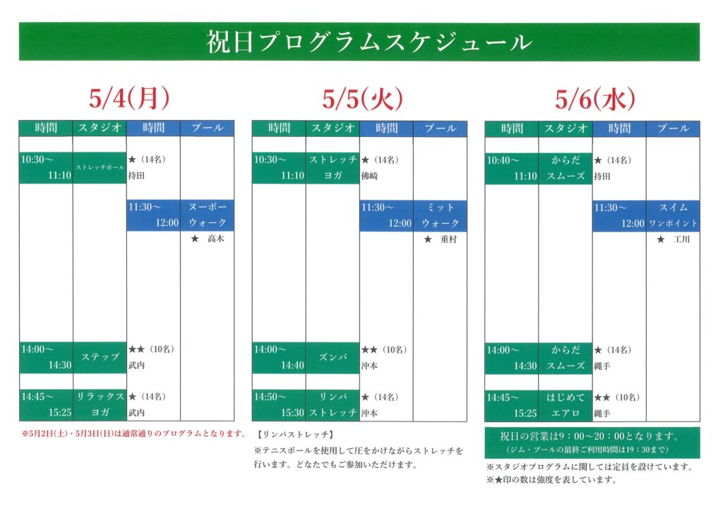 5月祝日プログラムスケジュール